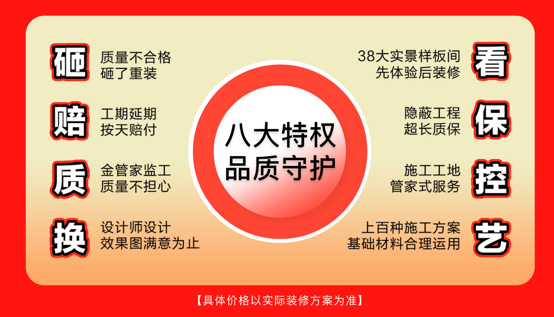 同時,我們鄭重承諾八大特權(quán)品質(zhì)守護,涵蓋從材料、工藝、工期到售后的全流程,具體包括但不限于:質(zhì)量不合格砸掉重裝,工期延期按天賠付,金管家建工安全放心,設(shè)計師設(shè)計到您滿意為止,38大實景樣板間先體驗后裝修,隱蔽工程超長質(zhì)保等,用白紙黑字的承諾,讓您徹底安心。